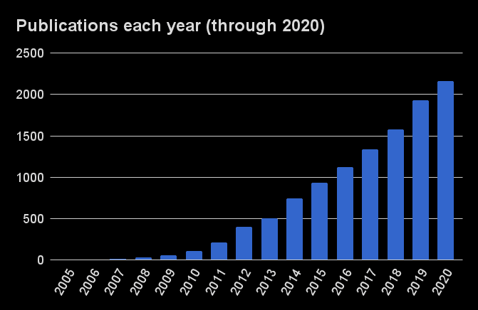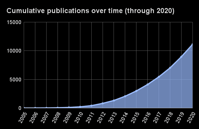 The Galaxy Publications Library lists every publication we know of that is about, references, or mentions Galaxy. We started tracking publications partway through 2011, so this may be an undercount for that year and previous years.