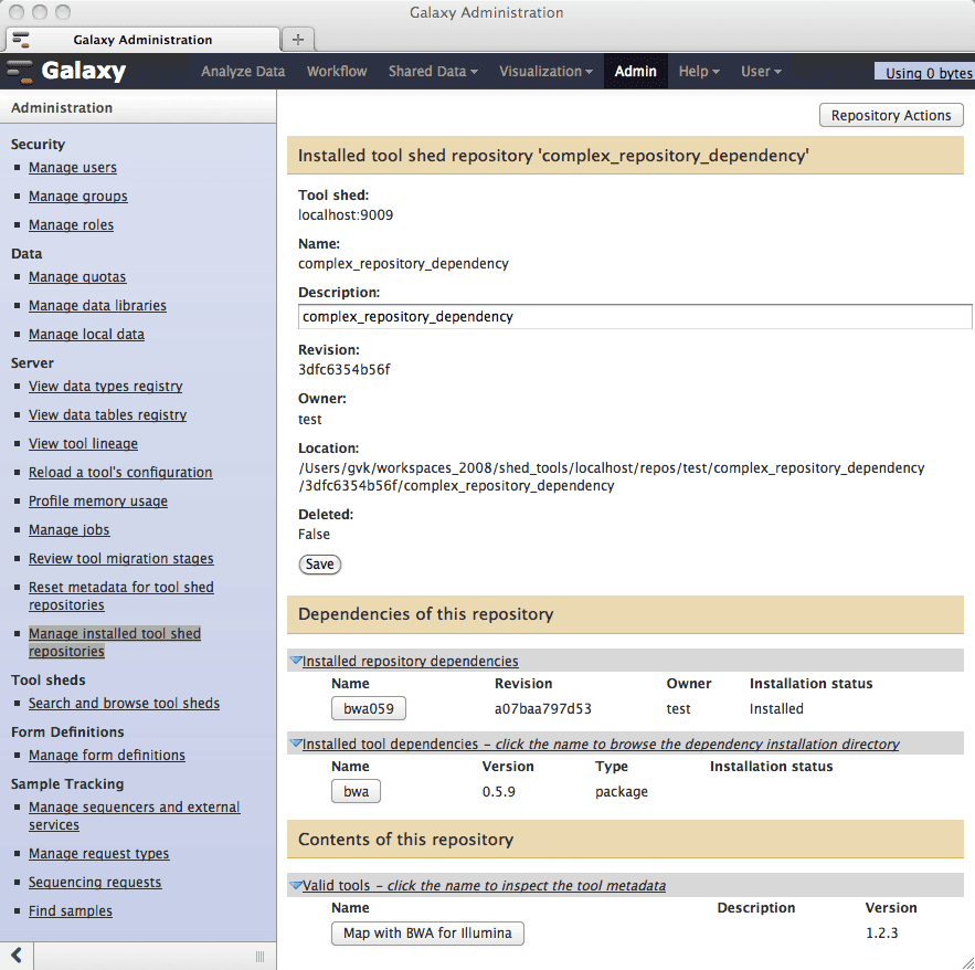Inspecting the complex_repository_dependency repository shows the installed bwa_059 repository dependency, the installed version 0.5.9 of the bwa package, and the Map with BWA for Illumina tool included in the repository. This is the tool that depends upon the installed bwa package.