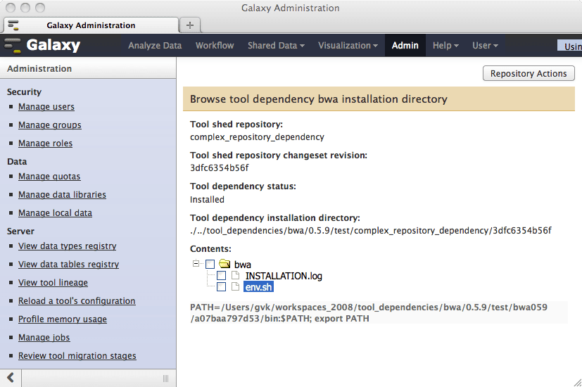 Let’s take a closer look at the installed version 0.5.9 of the bwa package associated with this repository. Browsing the installation directory of the package shows that we have only an installation log and an env.sh file. This is because the actual compiled bwa package was installed within the bwa_059 repository, which is a dependency of this repository. Notice, in fact, that the path value is the location of the installed bwa package /Users/gvk/workspaces_2008/tool_dependencies/bwa/0.5.9/test/bwa059/a07baa797d53/bin. When the Map with BWA for Illumina tool contained in this repository is executed, it will source this path to find the compiled bwa package located in the remote bwa_059 repository’s installation directory hierarchy.