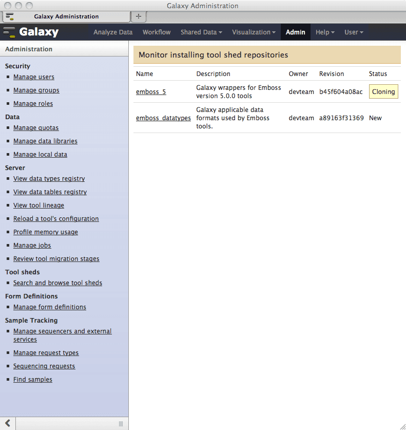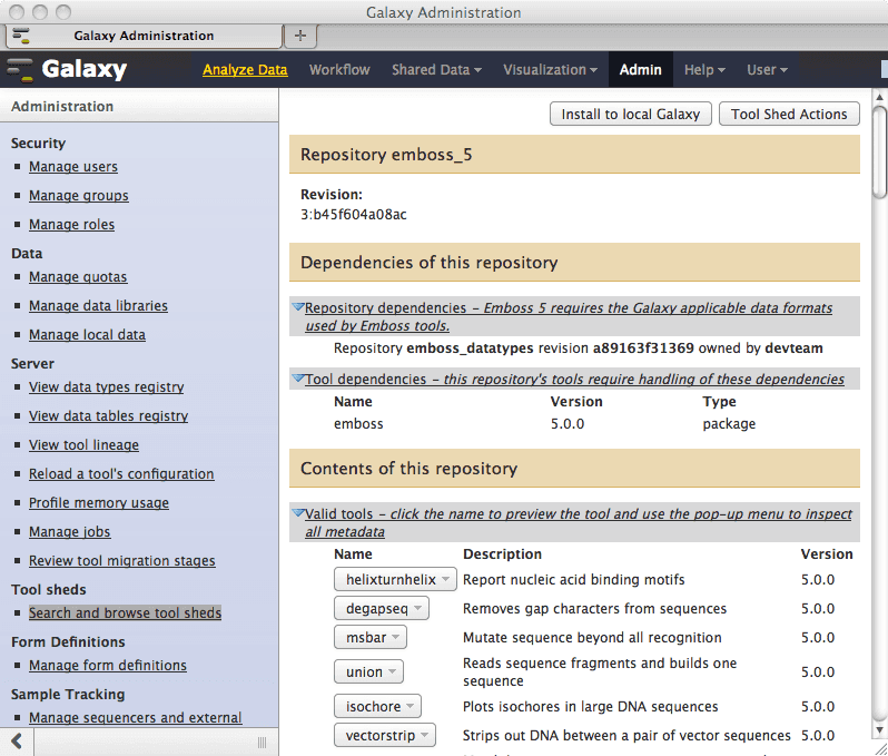 When the emboss_5 repository is installed into Galaxy, the emboss_datatypes repository will be automatically installed along with it if the Galaxy administrator elects to do so. Let’s see how this works.