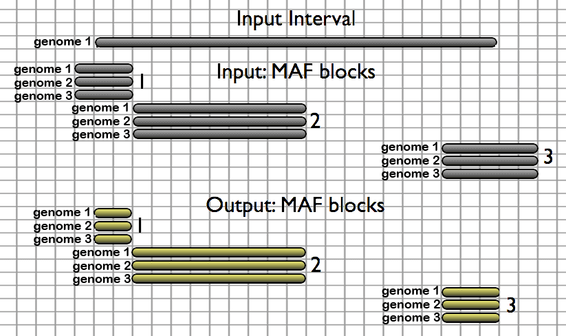 Extractors take genomic intervals as the input and return pairwise or multiple alignments corresponding to these intervals as illustrated below. Users can use locally stored ([cached](/main/data-libraries/Available Data/)) alignments, or alignments from their history as the MAF source. Here, three MAF blocks overlapping a single interval are extracted. MAF blocks are output relative to the strand of the provided interval, where the default is ’+’. Blocks 1 and 3 are trimmed because they extend beyond the boundaries of the interval: