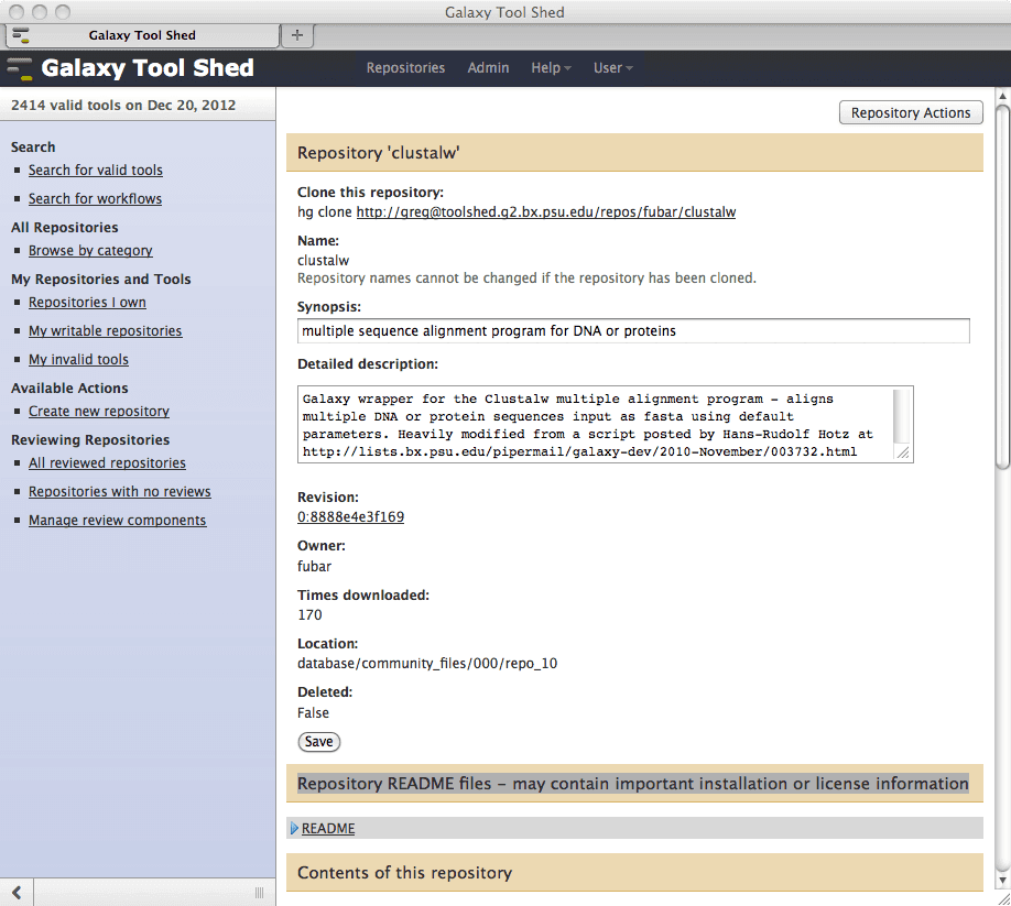 When this section is opened by clicking on the triangle or the file name link, the contents of the file are displayed. Here is the README file for the clustalw repository in the Tool Shed.
