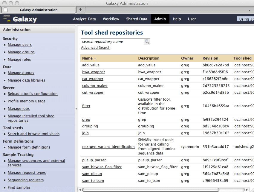Let’s assume we installed the ToolShed repository named nextgen_variant_identification that we found in the previous topic section when we searched the main Galaxy ToolShed for workflows whose name included the string “genome”. When we select the Manage installed ToolShed repositories from the Administration menu, this repository will be included in the list of installed ToolShed repositories.