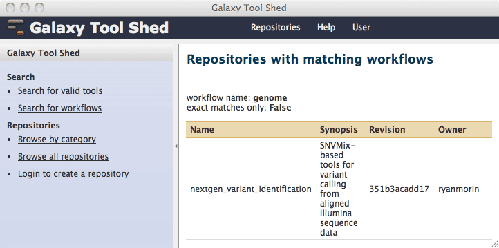 Clicking the Search repositories button will display a list of all repositories in the ToolShed that matched our criteria (i.e., the repository contains at least 1 exported workflow whose name contains the string genome).
